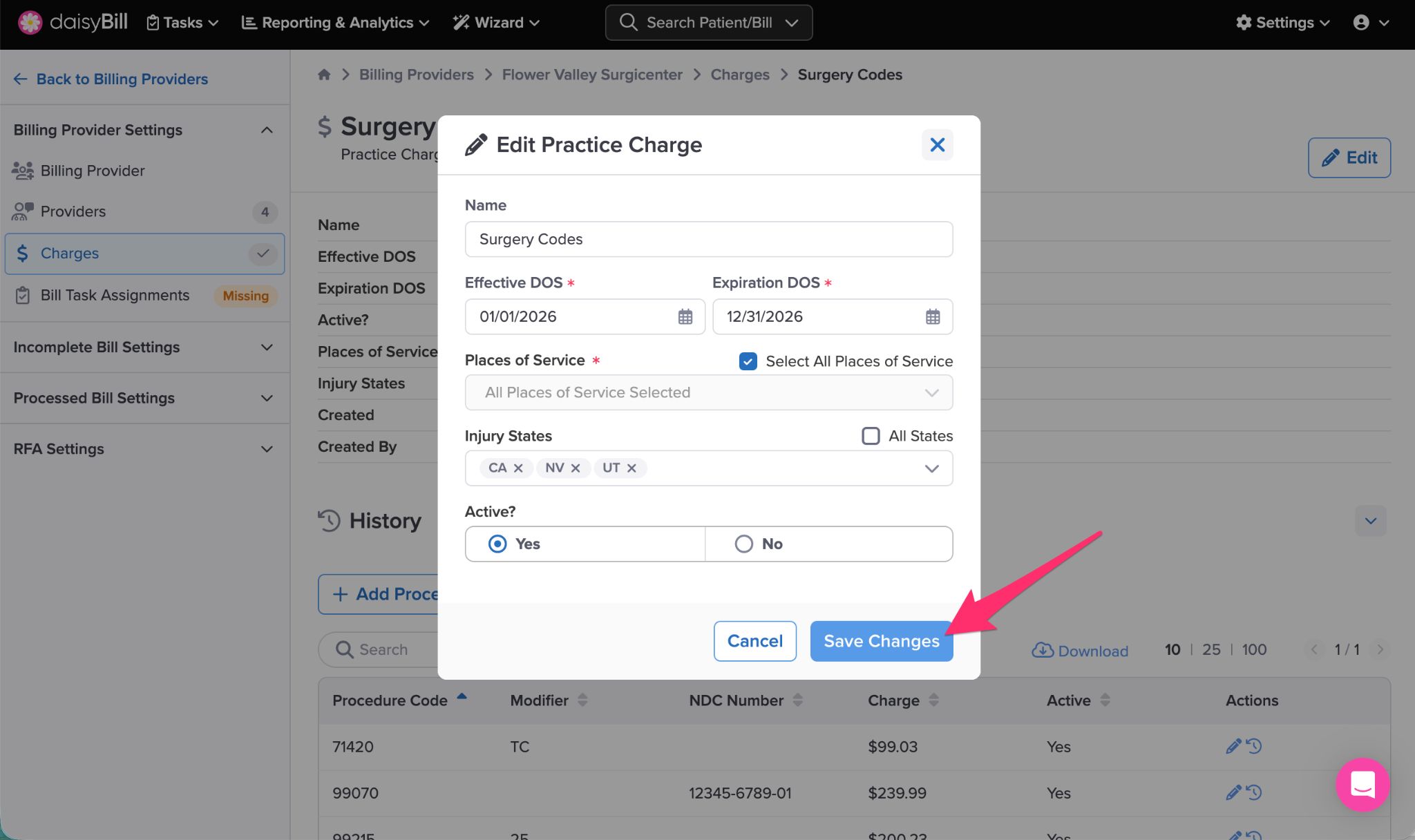 Step 15. To view a history of changes made to the Practice Charges, click ‘History’
