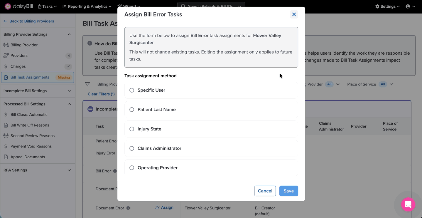 The default state for all tasks is ‘Bill Creator’. Tasks can be assigned based on a Specific User, the Patient’s Last Name, an Injury State, a Claims Administrator, or an Operating Provider.