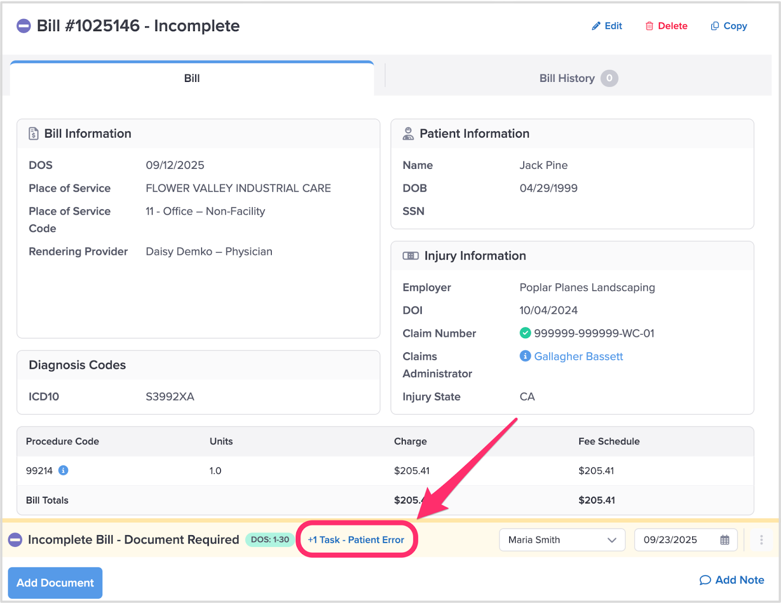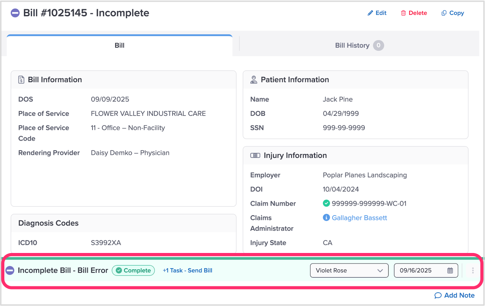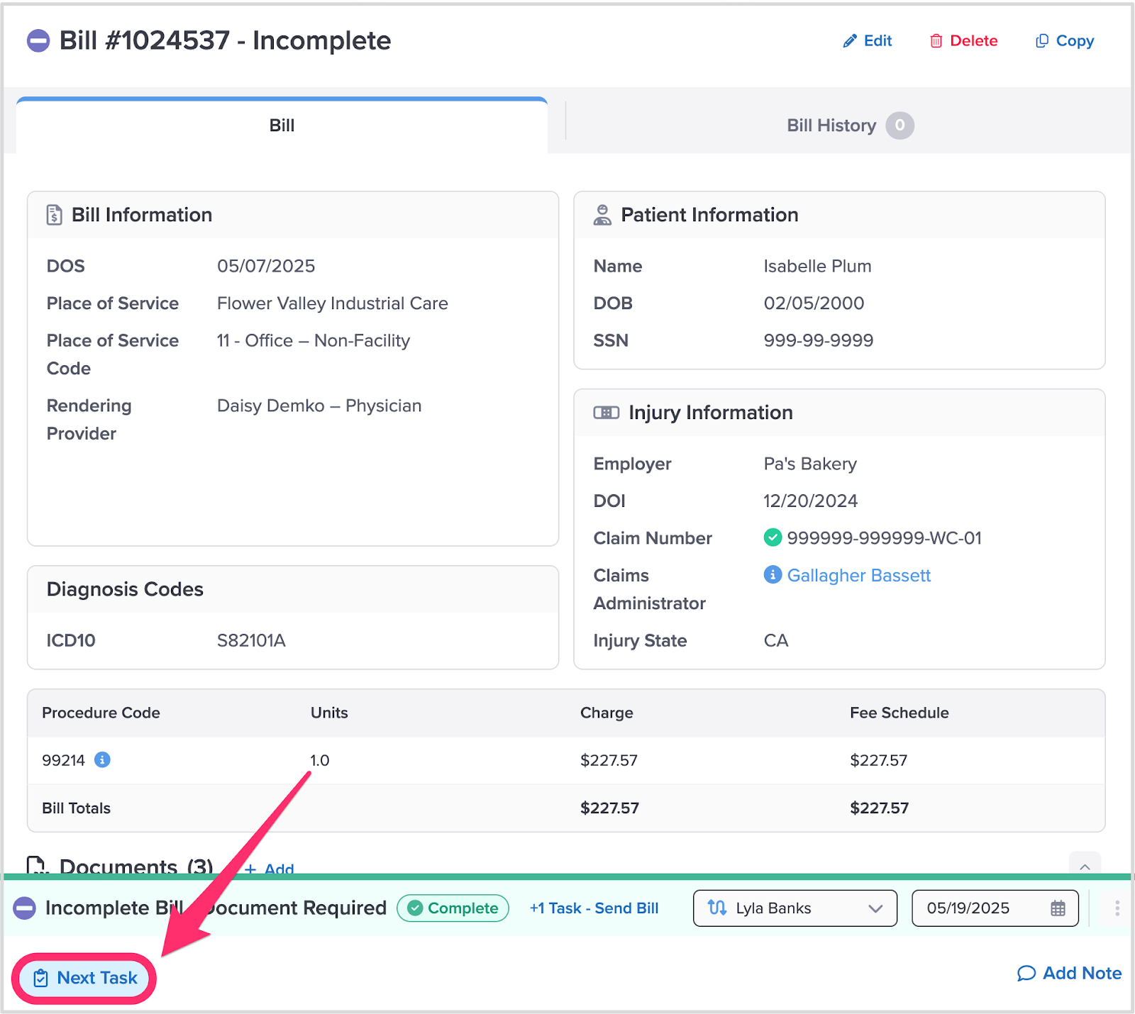 When a bill requires attention, the Taskbar displays the Task your staff needs to resolve to advance the bill through its payment cycle.