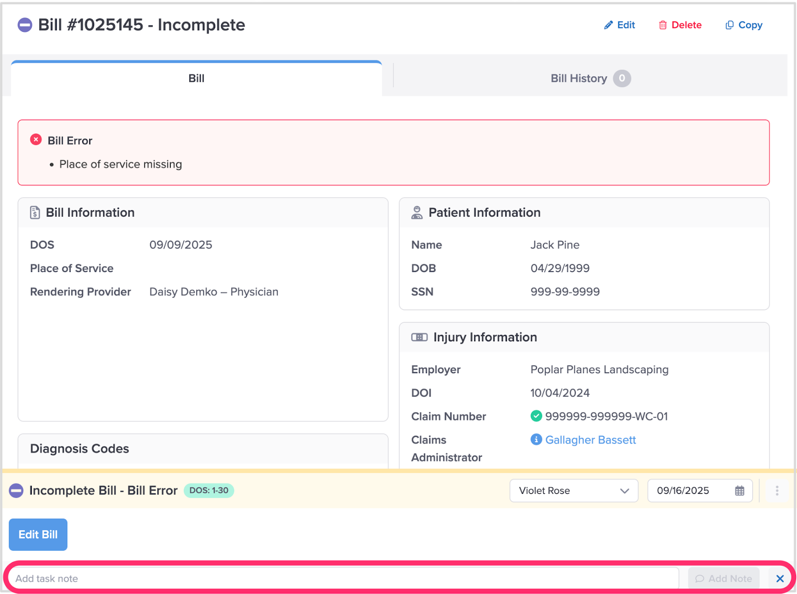 To provide additional information about a Bill Task, click ‘Add Note’ in the Taskbar.