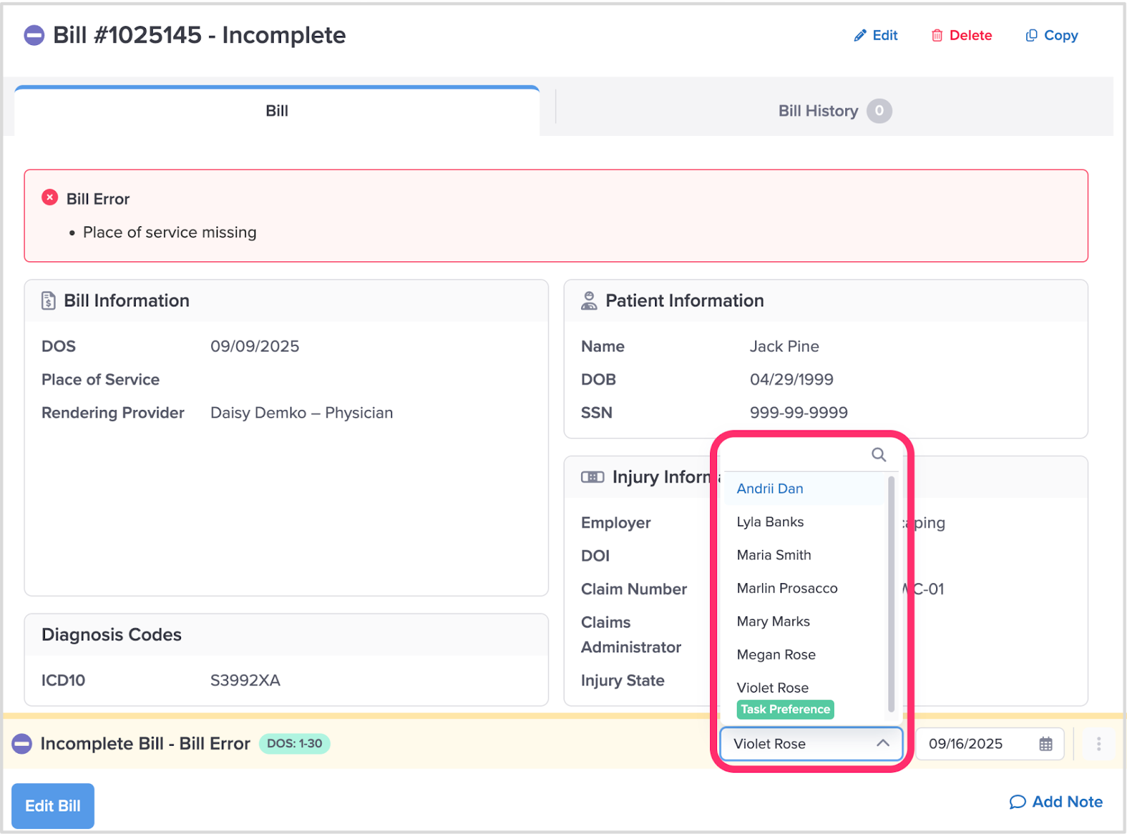 To reassign a Bill Task, click on the User Name and select a new User.