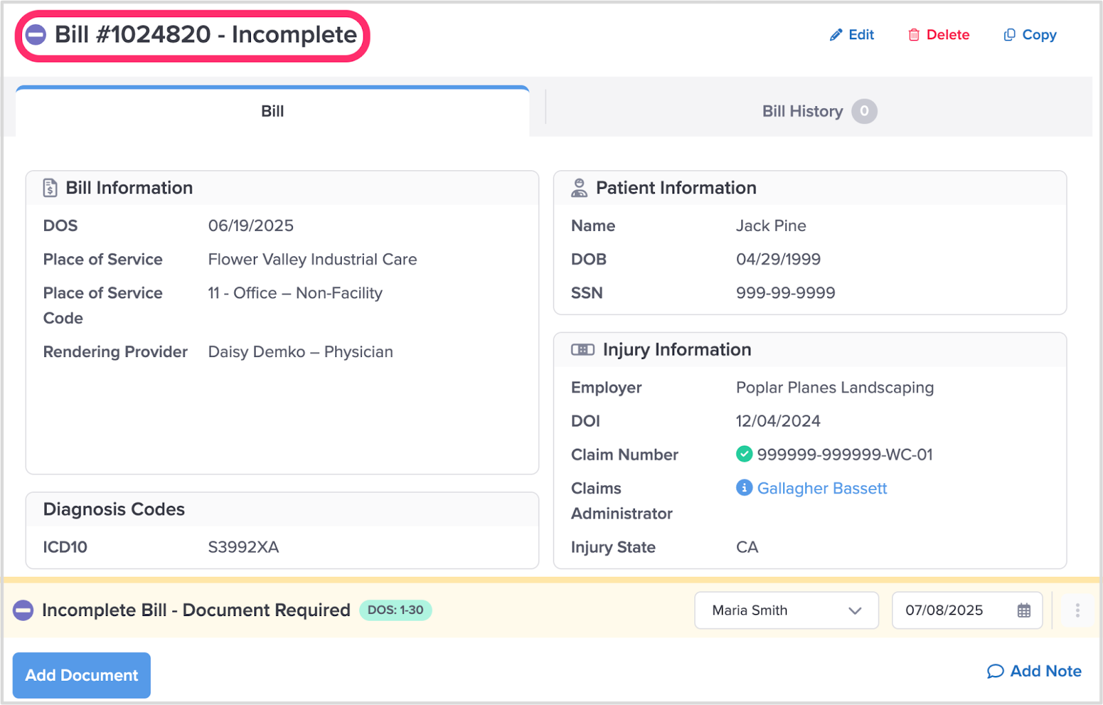 Incomplete Bill tasks prompt you to address errors that need correction before sending the bill.
